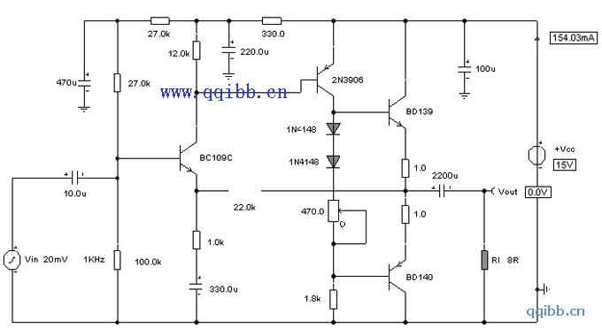 放大器经营在类AB 方式下;唯一470R预先设定了电阻器控制淡静潮流流经BD139/140免费产品晶体管。调整这里, 是一种交易在低畸变和低淡静潮流之间。典型地,在淡静情况下,备用潮流也许是15mA上升到150mA以50mV输入信号。