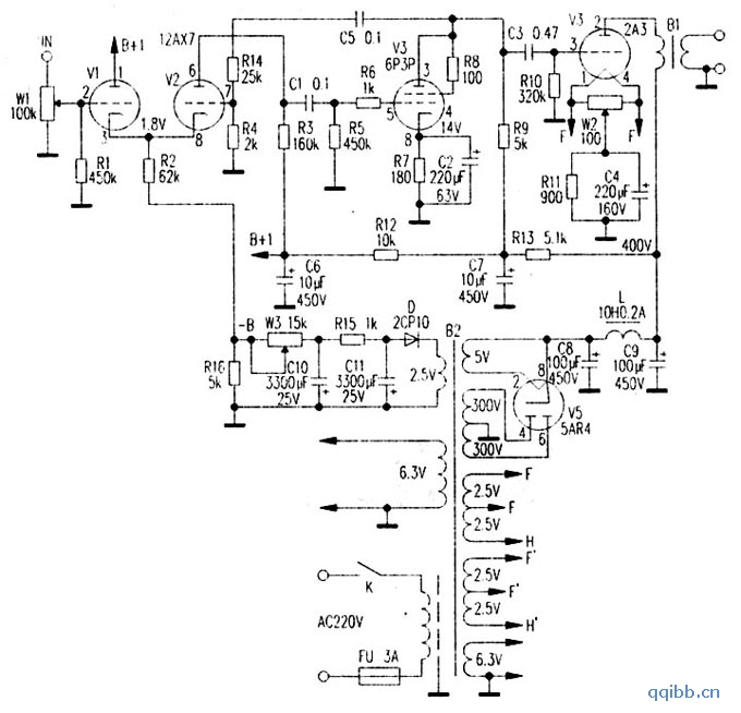 电源部分,B+高压采用胆整流及扼流圈的CLC滤波电路。整流管用5AR4.此胆的动态胜过其他常用的整流胆。整流管的优劣对放大器的影响并不亚于放大管;灯丝全部用交流供电;