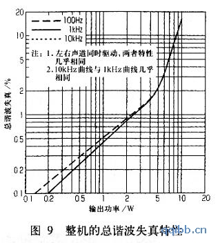 图9为失真特性,由于输出级未加负反馈,呈软失真特性,100Hz~10kHz失真曲线几乎呈现同样倾向。其中1kHz和10kHz失真几乎相同,100Hz失真只是在输出功率较小时(<2W)才略为有所偏离lkHz和10kHz曲线。这种特性也可以说是所有300B类管子的共同倾向。