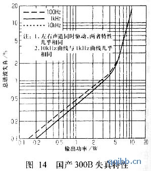 图14为国产300B的失真特性。它与WE-300B也十分相似,但在较低输出功率国产300B失真稍微小一点,而在较大输出功率时则剐相反,即WE-300B失真稍微小一点。