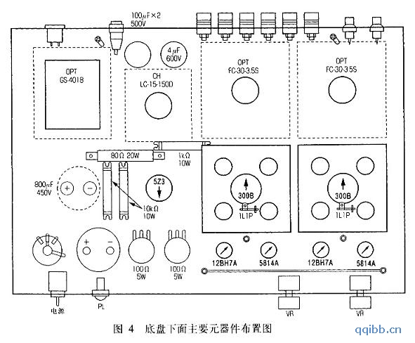 图4为底盘下面主要元器件的布置图。各管管座要注意安装方向,图4中用小箭头来表示。对于300B和523,箭头所指方向是管子灯丝的方向,即为管脚l和4之间的方向。对于5 8l 4A和12BH7A,小箭头所指方向为管脚l和9之间的方向。底盘上安装了两处接地点,一为“信号接地点”,安排在信号输入端子处;另一为“电源接地点”,安排在电源变压器处,都在图4中有所图示。另外,在靠近5814A和12BH7A 4个电子管处,安排了一根长的接地母线(可用1.5mm裸铜线)。应注意的是,上述两处接地点应与底盘保证可靠的电气接触,一般应把该处地盘仔细清除污垢,然后用螺丝把接地焊片紧紧加以固定死。对于接地母线则应注意勿使之与底盘有电气接触。一般应在母线两端用与底盘绝缘的端子把母线“架空”起来。由于接地母线是“信号”地,所以接地母线需另用导线单独接到“信号”接地点的焊片上去。