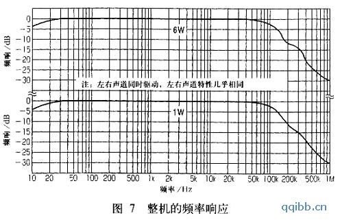 图7为整机频率响应曲线,输出1W时曲线实际上与输出变压器本身特性几乎相同,6W输出时仅高频端下降稍稍快一些。