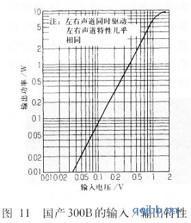 图11是国产300B的输入/输出特性。显然,它比WE-300B有较高的功率灵敏度。同样在输入信号为1V的条件下,国产300B输出功率比WE-300B高出1W。