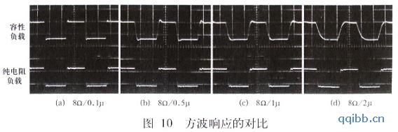 由图10(a)可知,0.1μF的容性负载几乎与纯电阻负载时响应完全相同。0.5μF负载时方波响应左角出现“振铃”,但过冲很轻微。负载容量增加到lμF,波形振铃处略微变钝。当负载容量增加至2μF时,波形进一步变钝呈现“圆角”。从以上测试波形可以看出,本机接上各种不同负载特性的音箱工作时,不会出现异常振荡现象,工作稳定可靠。