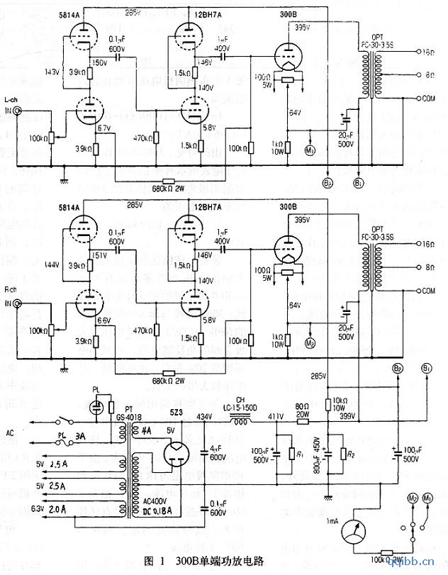 为了监视输出级工作电流,300B阴极经100kΩ电阻串有一只1mA电流表。这样一来,使该电流表转换成100V电压表,由于300B阴极电阻为lkΩ,每伏读数相当于lmA电流。60V相当于60mA静态电流。该表设有转换开关,以分别监测左、右声道300B工作电流。