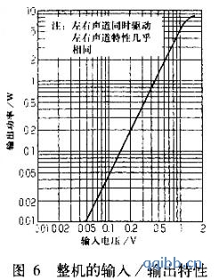 图6为本机输出级使用WE-300B时的整机输入/输出特性。制作时并未对该管进行过挑选,大致可以认为它反映了WE-300B的平均性能。由图6可知,输入1V信号电压即可达到6W无削波输出功率,而最大输出可达8W以上。