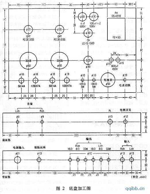 图2为底盘及其前、后部加工图,可采用2.0mm厚的铝板制作比较方便。当然,具体加工前应采购齐所有器件,再根据使用器件的实际尺寸进行适当修改加工尺寸。为了有利300B良好散热,特意为它加工了一块小的安装板,加工尺寸如图3所示,板厚为1.5mm铝板,300B及其安装方式已在图中表示得很清楚。