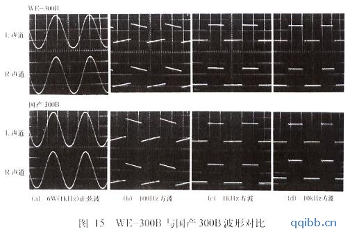 从以上4项测试性能看,与WE-300B相比。国产300B的内阻和极间电容略大一点,但两者还是十分相近。图15是WE-300B与国产300B的波形对比。图15(a)为6W输出时的正弦波波形,未见削波,可见尚有一定裕量。
