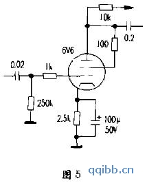 6V6也是音乐味较浓.音色优美,高频通透,声底雄浑,驱动能力强的功放管,推动300B会有更佳的表现,图5是6V6作推动缓的线路图,图中6V6是接成三极管使用的方式。输入级也用1/2 6SN7,此级担负着全机的主要放大任务,要尽量减小失真。本级工作在甲类状态.栅极负压取3.5V,屏极电流3mA,阴极电阻阻值则为3.5V/3mA=12kΩ,阴极电阻无旁路电容,使本级具有电流负反馈,因而工作稳定,失真低。由于300B管的线性好,所以本机不用大环路负反馈,整机瞬态好,工作也更稳定。本机全部使用三极管,因此整机的线性好、失真低,音色的表现也会令人满意。若增益级改用SRPP线路,可使本机的力度、分析力更佳,放大管用6DJ8、6N3或12AU7均可.但不同的放大管音效不同。