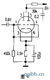 推动级V2用1/2 6SN7(6N8P),此管是中μ、低内阻电压放大管,线性好,音乐感亦好。由于300B的μ较低(5.32),要求栅极推动电压±30V,所以这一级选用6SN7,此级工作在甲类状态,C3是级间交连电容。如果阁下的底盘足够宽敞,可以容纳下较多的电子管时,此级不妨用双管并联使用,使内阻更低并提高驱动电压,并联使用的接法见图4。若底盘管孔是小九脚管时 可改用12AU7,推动效果也不错。