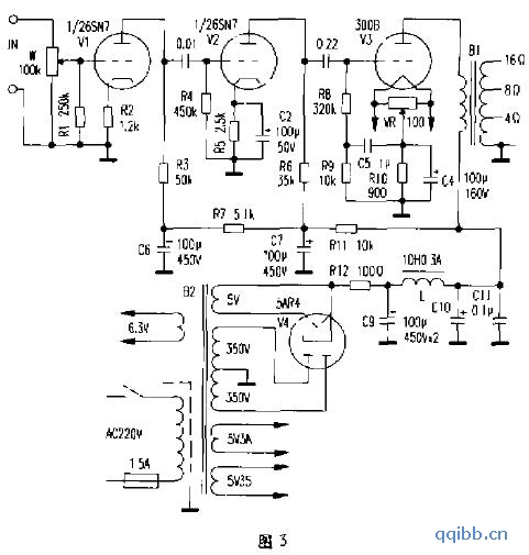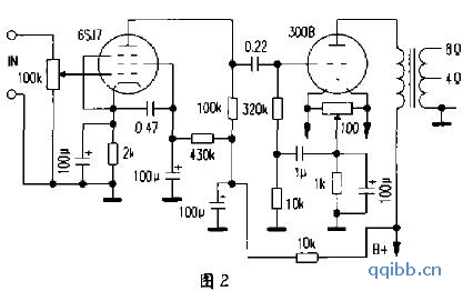 300B是上个世纪30年代研制生产的 本是工业用管,用于Hi-Fi放大器是在70—80年代才流行,所以流行的线路很少,300B单端机经典线路是用五极管推动,因为五极管的频响宽,更能发挥300B的特点,典型的线路是WE310A作电压放大的300B机,由于WE310A不容易找到,则现在较多是用容易找到的五极管6SJ7推300B的线路(其他五极管如6JB、6AU6等都可以用),见图2,还可以在增益级之后再加一推动级。近年来,由于数码音源的普及,数码音源输出电平较高,为了减少电压放大级的失真.而改用屏流较大的三极管作电压放大,如图3所示 从理论上讲五极管比三极管的噪音电平高,或输入信号电平较高时,易引起失真,但制作得法仍然可以得到满意的效果,所以焊机采用图2者仍颇多。下面就以图3为例谈谈制作要求: