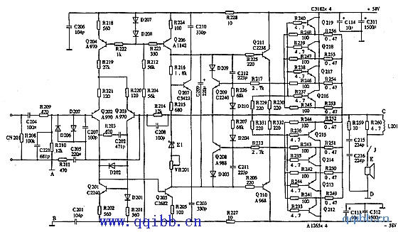 该机采用上述方法第一步通电试机时,发现中点C、D间电压偏高,且推动管Q210、Q211发热冒烟。立即停机,对电路元件反复进行检测、对比,均未发现损坏变质元件。后来对照原理图仔细核对电路,发现差分输入级Q202的基极上偏流对地电阻R210未与地线直接相接,而是通过插头座与调音台地线相连,再与电源的地端构成回路。而在通电试机时,为了方便,未与调音台相连,致使差分放大级Q202失去偏置电压,差分放大器失去平衡,经直接耦合,造成输出端中点(C、D间)电压偏高,烧毁互补大功率对管Q212~Q219。直接将R210接地线A与 功放 地线B相连,并对可能假焊虚接的与调音台相连的插座进行补焊后,再按照第一步通电试机,中点电压恢复0V,且调节输入端电压中点电压稳定。接入16只 功放 管进行第二步通电半小时,无异常现象。最后,去掉假负载,在C、D和E、D间接入低档扬声器和调音台,输入CD信号试听几小时,中点电压不变, 功放 管无明显温升。一切正常。该机交用户使用已二年,未再出现类似故障。此次安全维修,未损坏一只元件。