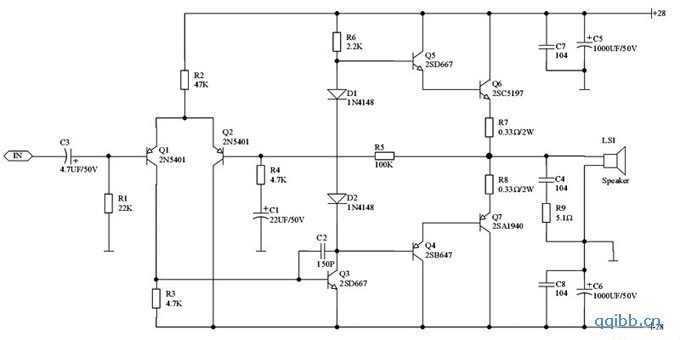 ②纯电阻负载调试 功放输出接8~10Ω 1/4W电阻,再测R7和R8两端压降,此时由于BG6,7通过此电阻形成各自独立的直流回路,R7、R8上压降可能会不一致,此时可再调整R2使此两电阻上压降一致,中点电压也就接近0V。如R7、R8上压降相同但未达13~17mV,则可调换D1、D2或微调上述2200微调电阻,反复1~2次,总之要达到R7、R8上压降相同并达到13~17mV,中点电压一般也就调好。