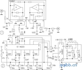 该IC是单列9脚封装,其主要电参数:工作电压典型为±16V,极限为±20V,输出功率在VCC=±18V时,在4Ω负载上每声道为30W,BTL接法可达80W;总失真度为0.15%;立体声道分离度为65dB;静态电流为70mA;闭环电压增益31dB。引脚功能:①R声道同相输入端;②R反相输入端;③内部中点电位;④R声道输出;⑤电源负极;⑥L声道输出;⑦电源正极;⑧L反相输入端;⑨L同相输入端。图1是HSH8927双声道简易功放电路,采用双电源供电,适合驳接台式收录机,若接VCD音频信号,必须加设前置驱动放大电路。如果需要更大的输出功率,可选用图2的BTL电路,输出功率可达80W。IC1是一个集成化5频点均衡器,调节各电位器可在70Hz、330Hz、1kHz、3.3kHz、10kHz的频段进行音频的提升或衰减。