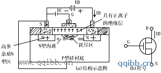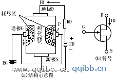 (1).结构原理 它的结构及符号见图1。在N型硅棒两端引出漏极D和源极S两个电极,又在硅棒的两侧各做一个P区,形成两个PN结。在P区引出电极并连接起来,称为栅极Go这样就构成了N型沟道的场效应管。
