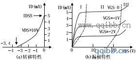 图2(a)给出了N沟道结型场效应管的栅压---漏流特性曲线,称为转移特性曲线,它和电子管的动态特性曲线非常相似,当栅极电压VGS=0时的漏源电流。用IDSS表示。VGS变负时,ID逐渐减小。ID接近于零的栅极电压称为夹断电压,用VP表示,在0≥VGS≥VP的区段内,ID与VGS的关系可近似表示为: