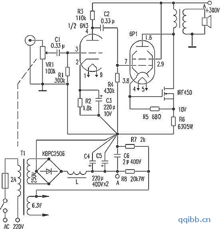 输入级为双三极管6N3,末级为6P1与IRF450共同输出。双声道只需电子管三只,6N3与6P1都是花生管,场管IRF450的市面折机品价位也十分低廉。
