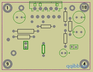 下面是PCB图,单面板,自己动手加工很容易的。因为只是纯后级,电位器就取消了;静音常开,开关也取消了;在输出端加入了3Ω/2W的电阻和0.1PF的喇叭补偿电路。下面左图为PCB走线图,右图为元件排列图。