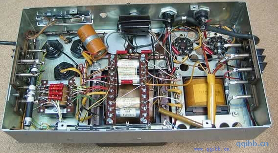 图(4) 在EL-34后的是电源牛,这机的电源牛是没有高压线圈的,是与一般的胆后级有别;次级线圈祇有灯丝6.3V和负偏压的50V 4ma的线圈,看图(3)线路图。那么!高压630V是取自电源牛的初级组250V的线圈,直接取电于交流市电,若所使用的市电低于250V,就须倚靠电源牛初级组的 “自偶”绕组线圈来提升电压到250V;高压取自于能量无穷大的市电,当然不愁电源牛供电不足的问题了。250V的绕组取电是经并联的整流 “硒”组 (看图(4)前面最左的两支黑色柱体 ),以“倍压” 整流方式:250V乘2.56倍等于640V(有10V电压消耗在输出牛的线圈上),由于高压直接从市电取电,所以全机的 “共地”和高压部份是不接触机壳的,祇用C6 / 5000PF将 “共地”接点连接机壳。