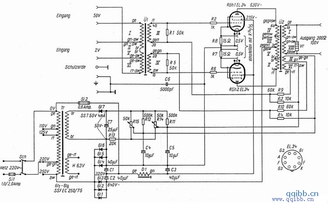 这Ela 2733所使用的EL-34是屏压630V、帘栅压315V、屏电流33ma就可轻易有50w RMS输出功率,而且还比马兰士8B、 9或DYNACO ST-70更安全的,笔者曾将某支劳损疲废的Mullard EL-34放在DYNACO ST-70机上,产生屏红现象,但将这EL-34插在Ela 2733机上,就一切工作良好;虽然是个别的案例,但可见Siemens厂的设计技术是有更高一层的智慧,Siemens厂所生产的主要是专业器材,对于功率管的使用安全范围,当然在耐用和可靠性能方面,是无须顾虑。但要留意一点是EL-34在630V屏压工作时,切忌改成 “假三极”的接法。