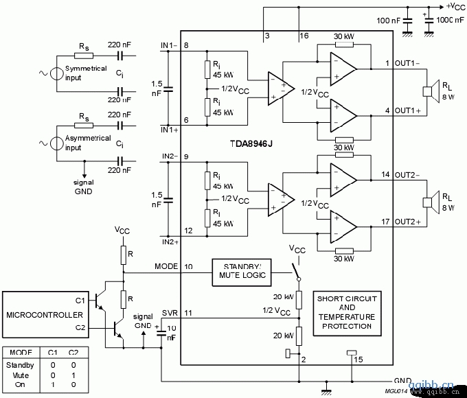 TDA8946J 是一个双通道音频功率放大器,内含两个BTL放大电路.在供电电压为18V负载为8欧时,可以输出2 X 15W的有效功率.