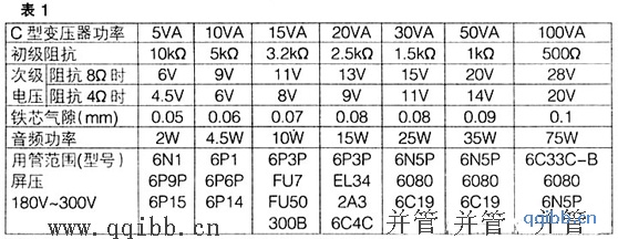 由于C型铁芯控制变压器初级绕组是按交流220V电压50Hz频率确定匝数的,如果要改成6P1、6P14、6P3P等工作电压在250V左右,中心频率在4001tz的单端输出变压器时,初级绕组不必改动;如果要改成并管6N1、6P12P等工作电压在110V左右的单端输出变压器时,可将初级220V两个绕组(中心连线断开)首首相连,尾尾相连。以上两种情况,次级两个绕组(中心连线断开)均同名端(多抽头)相连,由于改成单端输出变压器,为防止铁芯直流磁化,要将铁芯拆开,垫上纸片(厚度见表1),这项工作要首先进行,改制后变压器初次级阻抗与C型控制变压器功率大小及原标电压值相同,应根据欧姆定律计算,有关数值及用管范围见表2。
