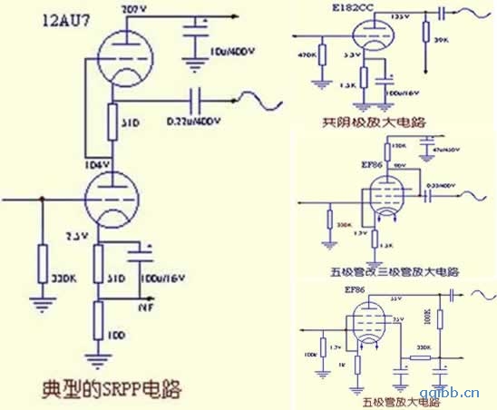 由于电子管的内阻较高,一般都需用变压器与负载来匹配(无论单端或推挽)。线路形式一般都比较简单,仅有2~3级放大即可。即电压放大级、推动级(或倒相级)、功率输出级。每一级按放大形式分,三极管有共阴极放大(具有高输入阻抗、大的电压增益、输出电压与输入电压反相等特点,是最常用的一种)、共阳极放大(即阴极输出器,电压增益小于1,一般用做缓冲放大,连接于低阻抗负载与高阻抗信号源之间)、SRPP放大(兼具前两种放大器之优点,尤其是中高频表现良好,是近来小信号应用最多的一种)几种基本形式。 小信号电压放大级:一般常用三极管共阴极放大、SRPP放大、五极管放大。当然也有少数采用差分放大(用于推挽功放,类似“自平衡倒相电路”)。个人认为,三极管共阴极放大的中低频较丰满,但高频欠佳;SRPP放大的中高频非常理想,唯低频不及三极管共阴极放大;五极管放大多见于古老的胆机电路,失真略大;差分放大指标较高,但胆味较淡。