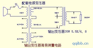 对于变压器除了看外观有无破损外,还要具体测量一下参数如何。电源变压器首先找到一次侧的220v输入端,然后通入市电,具体测量一下市电220的精确度,如相差较多,可用调压器调节后获得。然后对照变压器标签上的电压值,以及电路图中绕组电压分别测量各引出端子的电压是否正确,由于是在空载情况下测得,其值可能偏高些,属正常。然后测量一下输出牛,若你手头有电感表,可以大致测量一下具体电感、漏感的大小,由于测试频率不同,其结果仅有一定的参考价值(有关输出牛的测试将另文细说)。这里我们可以测量一下输出牛的直流电阻、抽头的对称性、阻抗比、及功率是否足够。对于常用的5.5KΩ推挽输出牛,其一次侧的直流电阻一般多在150Ω左右,关于对称性的测量,可以将5.5KΩ端(即P-P端)输入市电220V,然后测量P1~B+、B+~P2端的电压值是否相等,超线性抽头G1~B+、B+~G2端的电压值是否相等,然后测量一下二次侧的电压值,计算一下阻抗是否正确(注意效率一般取0.86左右)。然后再测量一下输出牛的功率,一般厂家给出的输出牛的功率是在30Hz或40Hz时确定的,所以体积都比较大。我们可以用50Hz交流市电简单测试一下,方法是:首先根据阻抗比确定在满功率输出时一次侧的交流电压值,本电路所供输出牛的功率为留有余量,选用LD35即35W的,这样若在8Ω端获得35W的功率输出,其一次侧5.5KΩ端需有408V的输入。这时可以用套件所提供的电源牛改接一下得到400多伏电压,电源变压器为方便烧友日后磨机,一般多配有70V/0.1A负压整流绕组,将这个电压串联在330V高压绕组上即可获得。然后将这个高压输入到输出牛的5.5KΩ端,在8Ω端接上一颗8Ω/50W的假负载(可用多只电阻串并联获得),然后通电工作一小时,看输出牛有无明显温升。