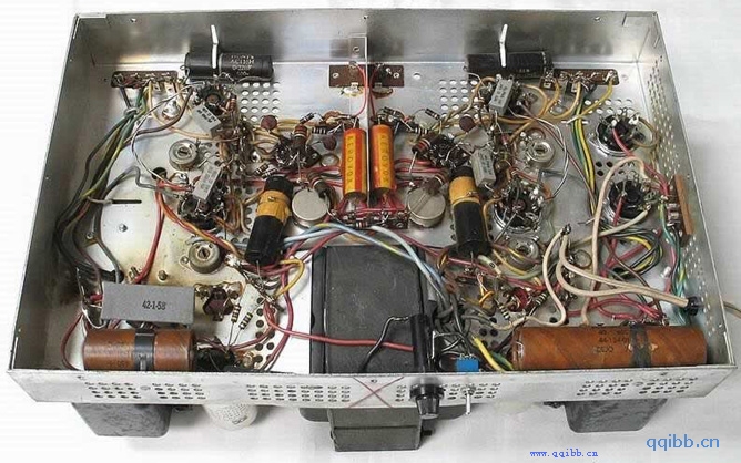 这台ELECTROHOME后级所使用的零件是颇有趣的,图(6)两声道一共有四支点色的英国电容Hunts作独立四支EL-34的交连电容。从机顶侧看,有支TCC滤波电容也是英国的图(7)。输出牛和电源牛相信是出自美国的产物。放大用的电阻全是美国AB碳阻。