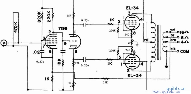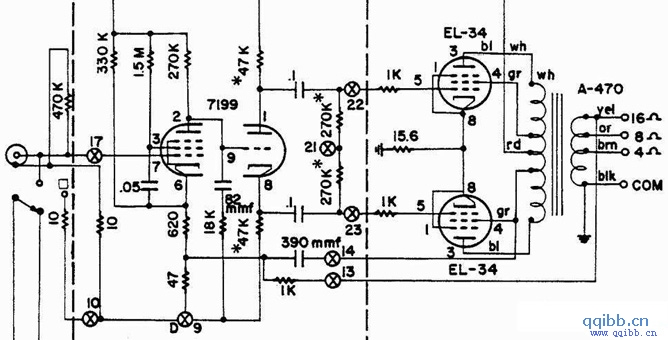 输出变压器:从外观看来ELECTROHOME无论是电源牛,输出牛和整台机的体积也比DYNA ST-70大一个size,是否好声是可与输出牛的体积成正比呢?不一定!但亦在某程度上,份量大一点的是佔有一定的优势,若在同等物料的条件之下,这两同是接近年期的古董机,我们暂可接受这点是好声条件其中之一。线路板与「搭栅」: 「搭栅」,意思是零件脚与零件互相直接銲上图(2);而线路板是在整齐的零件排列分佈之下,底部倚赖印刷的铜膜线路将各零件连接。当然「搭栅」是省略了间接的线路连接,若相比,在同条件的情况之下「搭栅」是价于印刷线路板的,这也是佔好声条件的一部份,但又不能视作为主要原因。线路处理的差别: 基本上DYNACO和ELECTROHOME用所的放大胆是完全相同,但路数值和微细的处理上,可看得出有一定的分别,图(3)和图(4)比较,又因这ELECTROHME制造厂的背景和历史记载不多,笔者曾尝试四出寻找线路,却杳无音讯,这也易于理解的。于是,拿来一份DYNACO ST-70的线路图,观察实物零件数值和引接并借助电脑修改成ELECTROHOME的线路,以供比较和参考。(一) 负栅压: 很多大功率的胆后级都喜欢在功率管的栅极(输入端)设有负极的电压,有可调或固定式两种。使用这负栅压的优点是可容易控制功率管的静态电流,亦可自由调节功率管轻微的电流不平衡现象(不配对的管),同时也可省略了功率管,控制电流的阴极电阻和阴极电极电容。由古至今,不少胆后级,为了方便和节省用料,因此常使用这方法;而DYNACO ST-70也是这样。 另一种控制功率管电流的方法,是使用阴极电阻和阴极电容,同时在功率管的输入端(栅极)不设负电压、或使用正电压的手法;虽然这是原始的方法,而又在于调校功率管的电流在可调的幅度上,大不如 “负栅压”的方式,因此适宜使用在较低功率的胆后级。这样的不设负栅压的方式,是属于A类放大,使用负栅压严格上来讲,算是AB类。 ELECTROHOME的设计师正是选择了好声的途径,就是「自级正偏压」,看图(4),两支EL-34第八脚阴极处,各用一支240Ω作阴极电阻,而共同接地的可调电阻20Ω是可调节EL-34阴极电阻,在可调电阻的电压降所存着的电压经220K电阻,回输到EL-34的栅极处提供「正偏压」,虽可调的幅度不大,但因这A类放大的处设计,声音质素方面是优越的,这点相信是ELECTROHOME胜于DYNACO的主因。另方面,这两后线虽同样设有负回输,且形式差不多,但轻微分别是DYNACO用620Ω和47Ω配合1K的分流回输份量,ELECTROHOME的回输电阻是27K直接引到胆的阴极1K电阻处,DYNACO的回输量高达20db有多;而ELECTROHOME的回输量约十多db。电源处理: 电源整流方面,ELECTROHOME是用两支5U4G整流管作个别并联,可提供足电流给两声道共同使用,这点也是优于DYNACO ST-70的5AR4/GZ34单整流管供电。再者,若暂撇开比较不同整流管的客观因素,包括:生产厂、牌子、国家与年代而言,在电气特性方面,5U4G是直热式整流管,而5AR4是旁热式整流管,通常是直热式较优胜的。 另一点,DYNACO ST-70的输出牛是有组抽头,作“超线性”的线路接法,而ELECTROHOME则没有这抽头接线,其EL-34的廉栅极是在电源部份加设一支电阻作π型降压滤波来提供EL-34的工作点。关于超线性接线法或廉栅极供电的四极接法,不能单凭这两种处理手法,在理论上判高低,祇是使用方法式而已,各有各不同特式,当然后者所使用的π型降压电阻和滤波电容封声音质素起了一定影响,但超线性的接线法就没有这牵涉因素。ELECTROHOME所使用的古董线电阻和滤波电容是相当高质素的。图(5)[!--empirenews.page--]