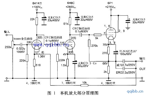 图1是本机放大部分的原理图。输入级兼电压放大由OTK生产的6H14п担任,为共阴极放大。6H14п产于1962年,采用玻壳小9脚双三极管封装,属旁热式中低μ低内阻电压放大管,参数见附表。本级供电电压为100VDC,阳极电阻取22kΩ,额定功率1W。阴极电阻取510Ω,额定功率0.5W。栅极电阻取220kΩ,额定功率0.5W。本级静态电流为2.6mA,栅负压为一1.36V,开环电压放大倍数为21倍。本级有电流负反馈与越级电压负反馈双重负反馈。