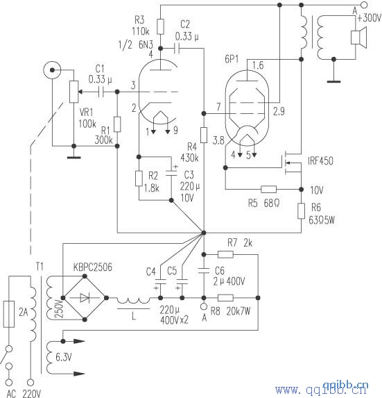 输入级为双三极管6N3,末级为6P1与IRF450共同输出。双声道只需电子管三只,6N3与6P1都是花生管,场管IRF450的市面折机品价位也十分低廉。
