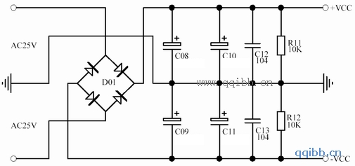 为了保证功放板的音质,电源变压器的输出功率不得低于80W,输出电压为2*25V,滤波电容采用2个2200UF/25V电解电容并联,正负电源共用4个2200UF/25V的电容,两个104的独石电容是高频滤波电容,有利于放大器的音质。