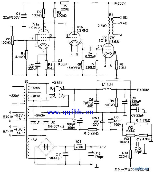 要胆工作良好,其工作点与负载阻抗的选取十分重要。6C19的内阻为300Ω,输出变压器的阻抗取1~1.5kQ比较合适。正好在网上见有人卖5W/2.5kΩ的单端输出变压器,功率合适了,而阻抗则略显偏大,不过阻抗大一点有助于低频的表现,于是买了一对。实际使用后,效果不错。综合6C19的特性与推荐的工作状态,最后其工作点是屏压200V,阳极静态电流45mA。为了改善6C19的动态表现和低频控制力,这里没有用常见的自给偏置,而是采用了固定偏置,由D1、D2整流,C7滤波后输出一个约250V的负压,经R10、DW1稳压,W2、R11分压后,提供6C19所需的栅压。另外,6C19采用了固定偏置后,可提高电源的利用率。由于6C19的负压高达约-60V,也就是说,如把输入灵敏度设为1V的话,推动级要有不低于60倍的增益才能使6C19达到满功率输出,因此对推动级的要求较高。常规的做法有以下几种: