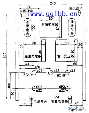 我们制作一台胆机,不但要求其音质优美,外观也不能忽视,因为一件音响器材,其功能不仅是供我们欣赏音乐,而且还应该是一件家居装饰的艺术品,在视觉上要求美观、大方,给人一种赏心悦目的感觉。为此,在制作这台胆机时,笔者采用了对称式的设计,其底板加工如图4所示。