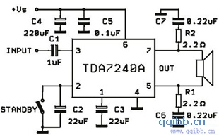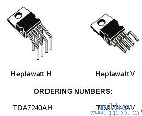 TDA7240A这款专为汽车音响设计的20W功放IC,内部由两个放大电路组成,直接应用在BTL状态,外围电路极简.工作电压范围:18--40V 单电源供电,各端脚作用如下:①脚信号反馈;②接地;③脚输入端;④脚j电源地;⑤脚为输出端;⑥脚为电源+;⑦脚为输出端。