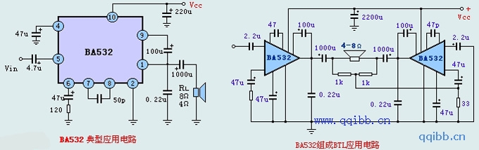BA532与用于OTL电路的低频功率放大电路,输出功率高达5.8W,内设负载短路、过电压和过热保护电路,单列10 脚封装,电路特点有: