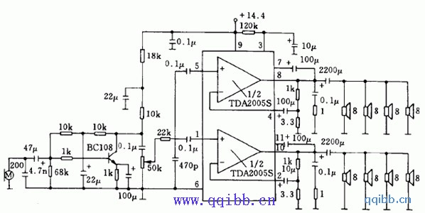 下图是采用TDA2005S的公共汽车收音,扩音电路,图中输入法端可以接话筒或收音机信号输入。每个TDA2005S输出10W功率,可以分别4个扬声器。总共可以带8个,分放在车内不同地点。总功率可达20W。