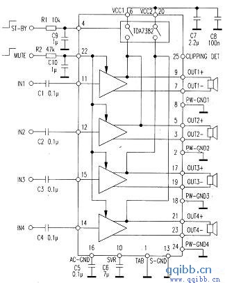 TDA7382 是意法半导体公司新推出不久的汽车用 AB 类功放集成电路,它采用 25 脚单列FLEXIW ATT 封装。内有 4 路22W PNP/NPN 互补晶体管构成的桥式 AB 类音频功率放大器,是高档汽车理想的多声道功放集成电路,其应用电路见附图。由图可看出,它的外围元件极少,因此故障率极低。在不带自举电容器情况下,该放大器允许满摆幅输出(即输出电压的幅值接近电源电压幅值)。TDA7382 内置钳位检测器,能对电源进行自动稳压。另外,它还具有待机、静噪及电池极性反接、短路和过热保护功能。TDA7382 主要电参数如下:电源电压 10~15V;静态工作电流 180mA;电压增益 26dB;在VCC=14.4V,RL=4Ω,f=1kHz,THD=10%的情况下,输出功率为 4×22W,最高结温 150℃。