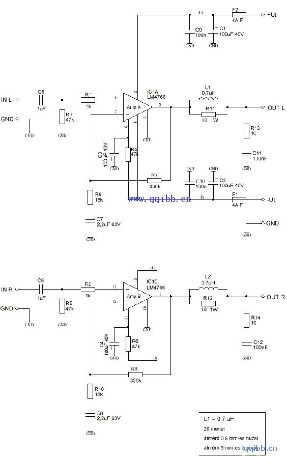 LM4766是美国NS公司推出的双声道大功率放大集成电路, 每个声道在8Ω的负载上可以输出40W平均功率,而且失真小于0.1%,30W功率输出的情况下仅仅只有0.06%的失真 和噪声值。