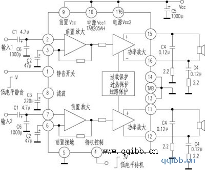 经查资料,东芝公司生产的同系列TA8210AH、TA8215AH、TA8221AH及韩国产的KIA6210AH、KIA6216H封装形式、引脚功能完全相同,其中KIA6210AH输出功率与TA8205AH相同,其余几种输出功率略有差异(TA8210AH为20W×2,TA8215AH为18W×2,TA822AH为30W×2,KIA6216H为15W×2),可以互换。TA8205AL、TA8210AL、TA8215AL、TA8221AL内部电路也完全相同,只不过采用了17引脚单列直插封装。本机采用TA8210AH代换后现已正常工作数月。