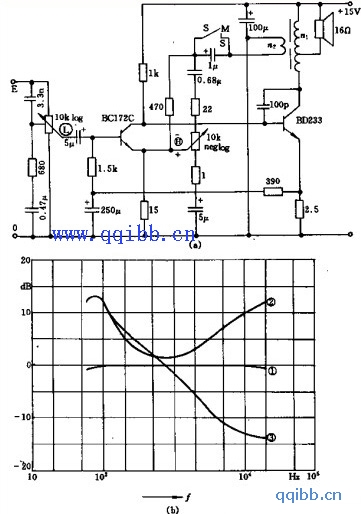 图(a)电路两级直接耦合放大,第一级从第二级发射极抽取基极电流,从而形成很强的直流负反馈,稳定工作点。扬声器通过自耦变压器与未级匹配,这样,采用小铁芯也能有良好的频率特性。变压器的附加绕组W2提供隔直流负反馈信号。
