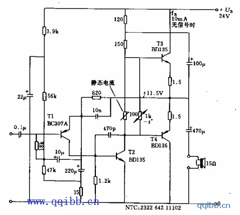 该电路输出级采用互补晶体管电路,在环境温度50°C以内工作时其散热元件热阻Rthk≤73k/w,前置级和推动级晶体管不需要散热器。
