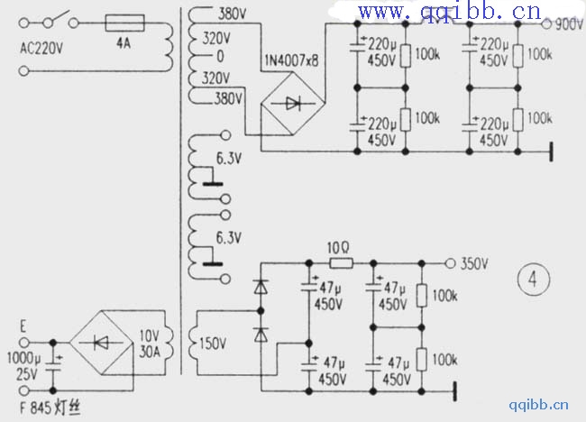1)845灯丝最好直流供电,整流要用30A以上的硅桥,紧贴机壳,便于散热。