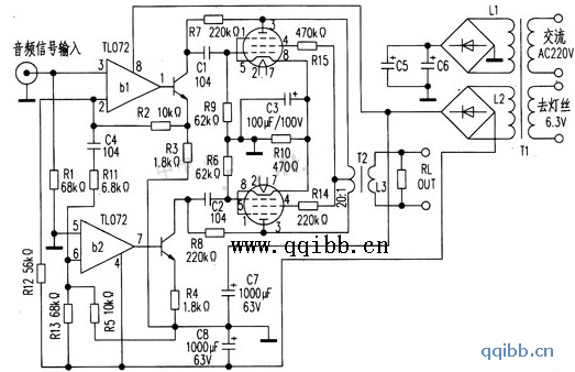 这是款胆机功放,该功放经长期测试感觉其音质、效果都很不错,现介绍给大家。该功放用了两只el34型胆管和一对晶体管、运放块tl072等元件组成,运放器b1/b2与晶体管q1、q2构成两个完全对称的跨导式放大器,由于这个电路具有输入阻抗高、输出阻抗低、稳定性好、失真小等众多优点,所以值得胆机爱好者一试,安装完成后,如焊接无误,无需调试,一装即成(电路 见附图)。该放大器输出功率大于30w,失真度小于2%。