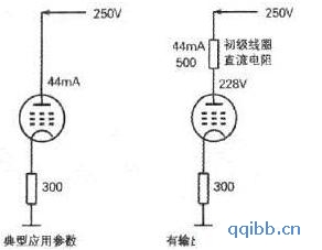 在电子管手册中我们都能查到功放管的典型应用参数,一般都有屏极工作电压这个参数,例如6P1电子管的屏极电压手册上推荐为250V,有很多制作图纸和发烧友在实际制作中都按照这个参数来选择电源变压器的交流输出电压,实际上这样是不好的,并不能很好的发挥功放管的性能,因为在屏级回路中串有输出变压器。输出变压器的初级线圈是有直流电阻的,当静态电流流过初级线圈时便会产生电压降,这时加到电子管屏极的直流工作电压就会降低,其它参数随着屏极电压的改变也相应变化,我用下面的图1和表2给大家说明。