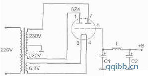 图给出了一个整流滤波电路,该电路中变压器次级高压只有一个线圈,这样在铁芯窗口相等的情况下线径可选粗一点,绕制时也方便简单得多,高压绕组先经过晶体二极管进行桥式整流,这样电容器C1的容量就可增大至数百甚至上千uF,经C1滤波后的直流再经6Z4进行二次整流,这样做的目地是6Z4整流管具有高压延时的作用,可防止对功放管屏极的损坏和省略高压延时起动电路,而且比单纯用晶体二极管整流更具有胆味,电容器C2的容量一般选择200u F以下,由于整个电路中滤波电容有足够的容量并进行了二次整流,这个电路输出的直流电源纹波已经很小了,这对保证整机装好后有一个宁静的背景创造了条件。根据功放电路对电流的不同需求可选择相应的电子管整流管。