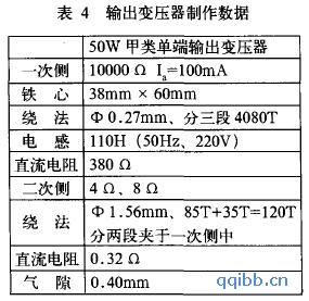 本机输出变压器是关键部件,一次侧与二次侧线圈相位相反,这是应电路负反馈要求。当然,若发生音频振荡时,可把一次侧B+与P接头对调即可。一次侧电感应大于110H (测试条件为220V/50Hz)。注意普通电感表所测电感为初始电感,其数值一般小于实际电感。本机所用输出变压器及电源变压器均由凯立厂定制。发烧友若想自制,表4给出了制作数据。一次侧分3段绕制,层间绝为0.08mm电缆纸,组间绝缘为电缆纸加聚酯薄膜加电缆纸三层结构。二次侧分两段夹在一次侧中。