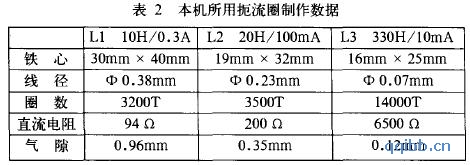 滤波电感可采用扩音机电源扼流圈,成品如飞跃150型的,规格为10H/0.43A,安装于底板上面。若自制,制作数据列于表2,注意其底筒与外壳必须具有高耐压绝缘,要能长期承受1500V电压才行。