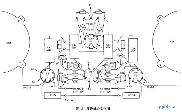 前级电路输入级6SL7GT、推动级6SN7GT和阴极输出推动级6L6GC三管电路使用元件较多,采用搭棚方式,由3只接线架完成,力求元件单层布置,疏密得当,实体图如图5。所用阻容元件都是通过计算或查应用图表获取,并已装机检测证实。音量电位器使用ALPS100KA×2,电阻未标注功率的均为1/2W ,100pF带通滤波电容宜用云母介质的。4只耦合电容均使用斯碧维他命0.1 600V油浸纸介电容。6L6GC阴极电阻22kΩ/5W 实际功耗2.2W请使用耐热的金属膜电阻,可靠性要高,一旦断线将使FU-5板流大增而发红,危及功放管安全。它接于-210V电源端给阴极输出器提供一个10mA的静态电流,可使推动内阻低且失真小。FU-5的灯丝平衡电位器用100 Ω线绕的大于2W即可,电位器手柄穿底板上只能使用内磁式,否则将产生较大误差。该电流表中通过的电流为板流加栅流,所以大动态时,电流表指针向上摆动属正常情况。这一点与甲类输出管不同,而中等音量以下栅流近似于零,电表指示则为板流。电流表满度电流可选用125~150mA规格。
